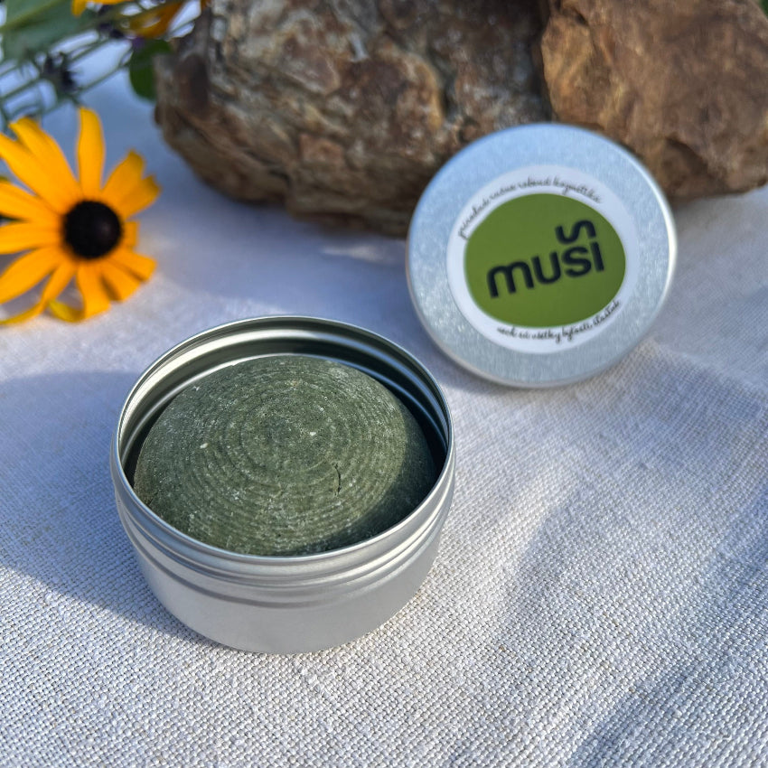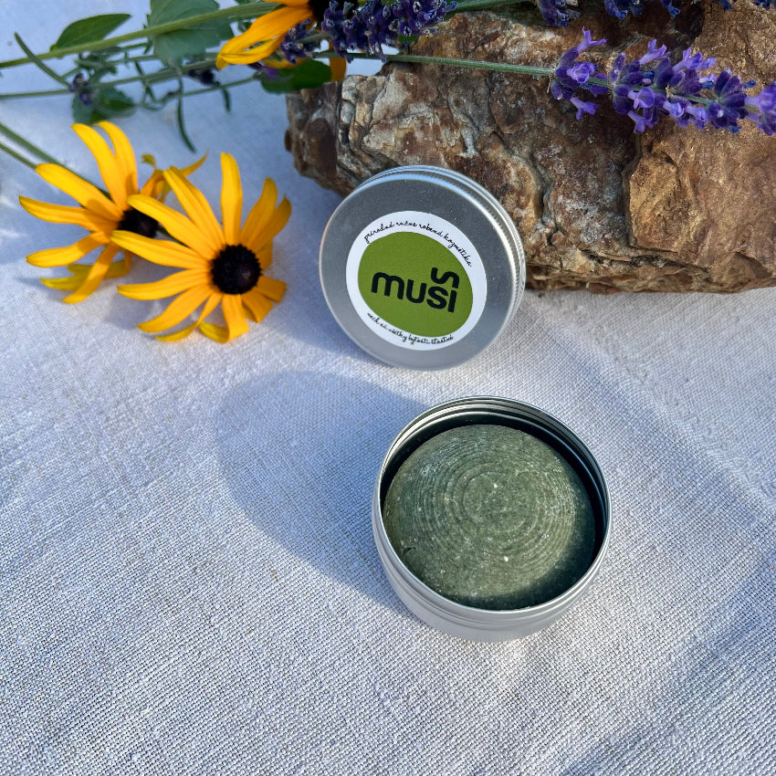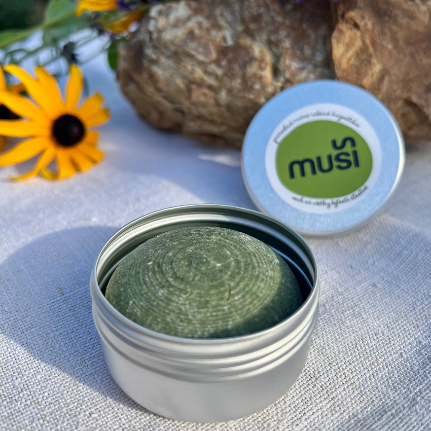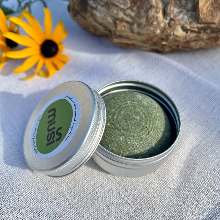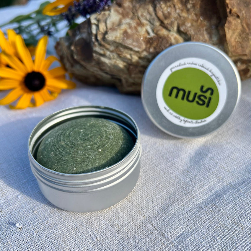 Hliníková dóza na tuhý Muši šampón